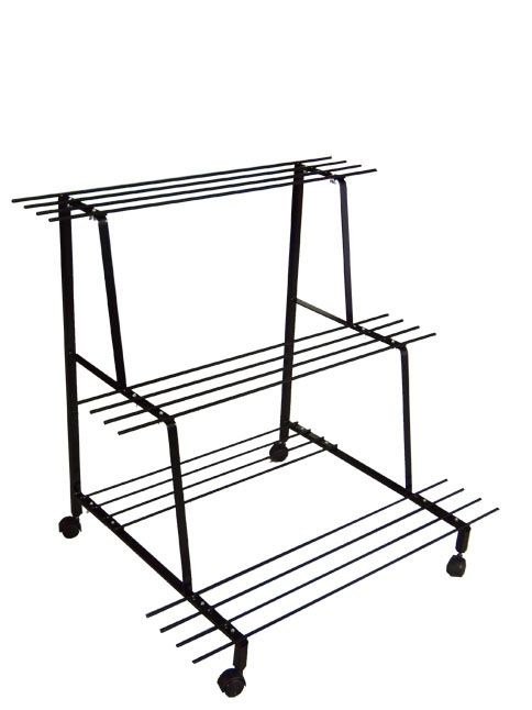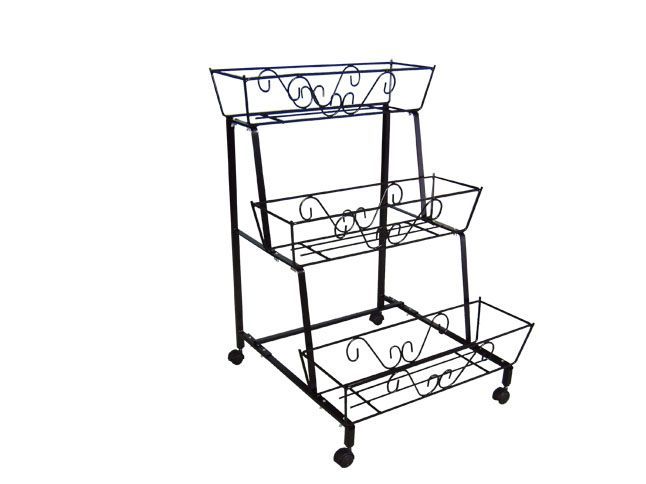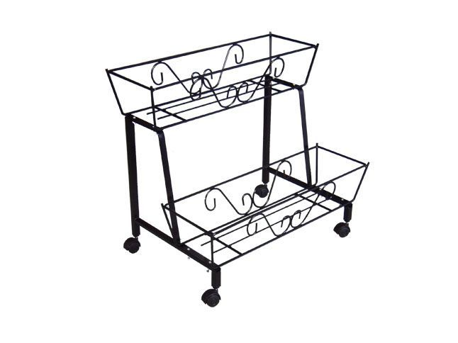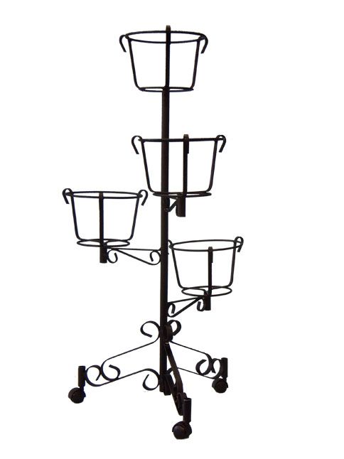 Scalette a 2 e 3 piani, piantane a 4 e 7 cestelli, fioriere con piedi, con ruote, verniciate con polveri epossidiche e trattamento antiruggine di base.